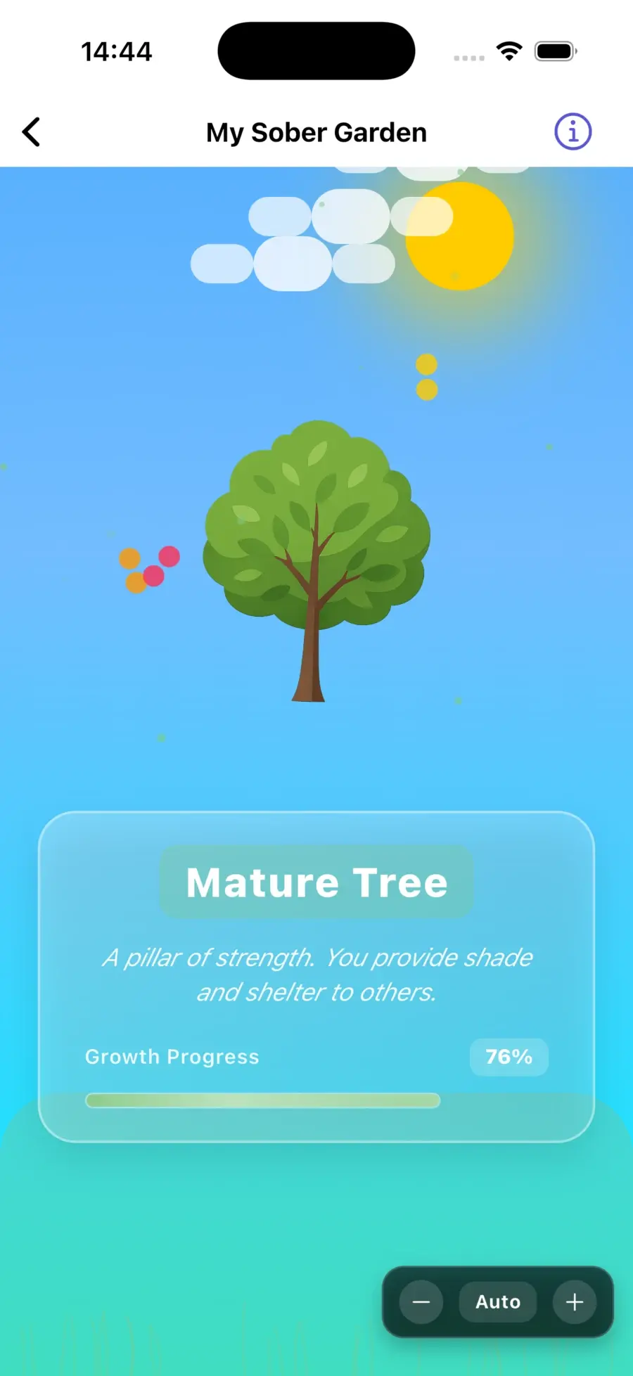 Every sober day grows your garden. Start as a seed on day one, become a magical tree after a year. It's a simple idea — but seeing your plant evolve makes progress feel real.